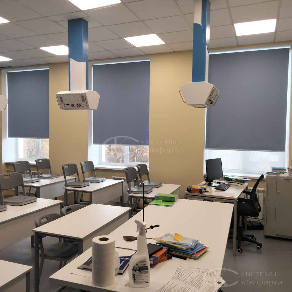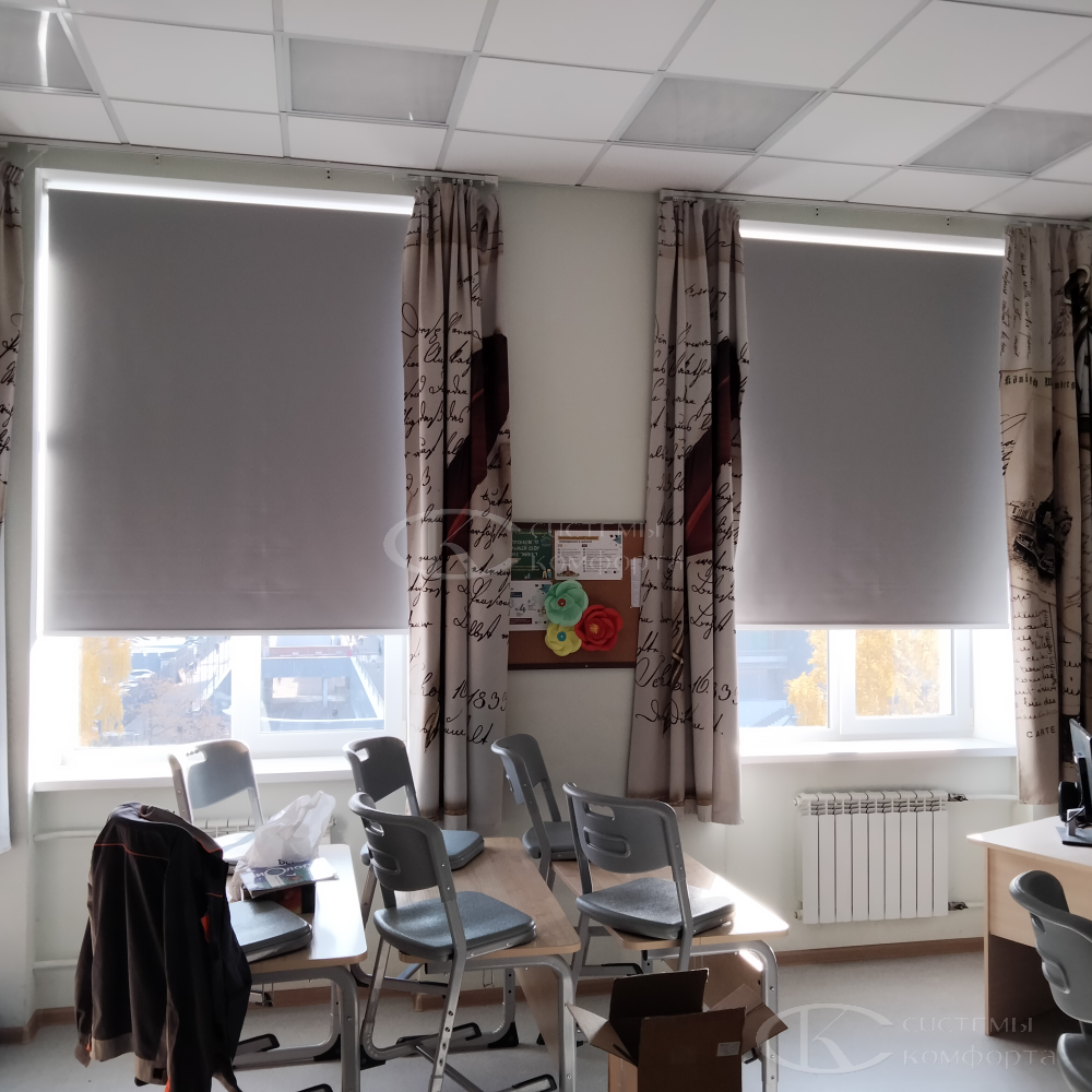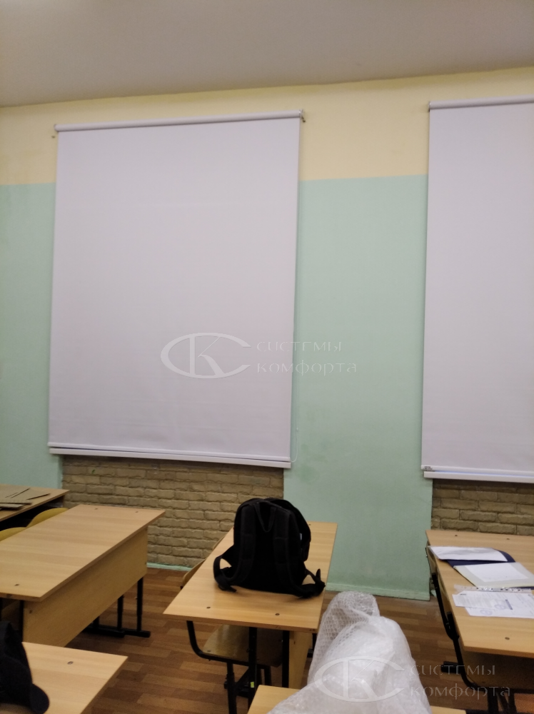 Часто их называют рольшторами. Механизм работы прост: с помощью цепочки ткань поднимается и опускается. Как правило, рулонные жалюзи устанавливают на одном-двух окнах, ближайших к доске, для затемнения в классе, если часто используется в работе проектор. В этом случае рекомендуем выбрать ткань «blackout» со 100% защитой от света. Но в этом случае надо понимать, что сама по себе светонепроницаемая ткань не создает полного затемнения в классе, так как просветы в любом случае будут по краям изделия. Плюсом будет то, что ткань на этапе производства обрабатывается специальными пылеотталкивающими растворами.