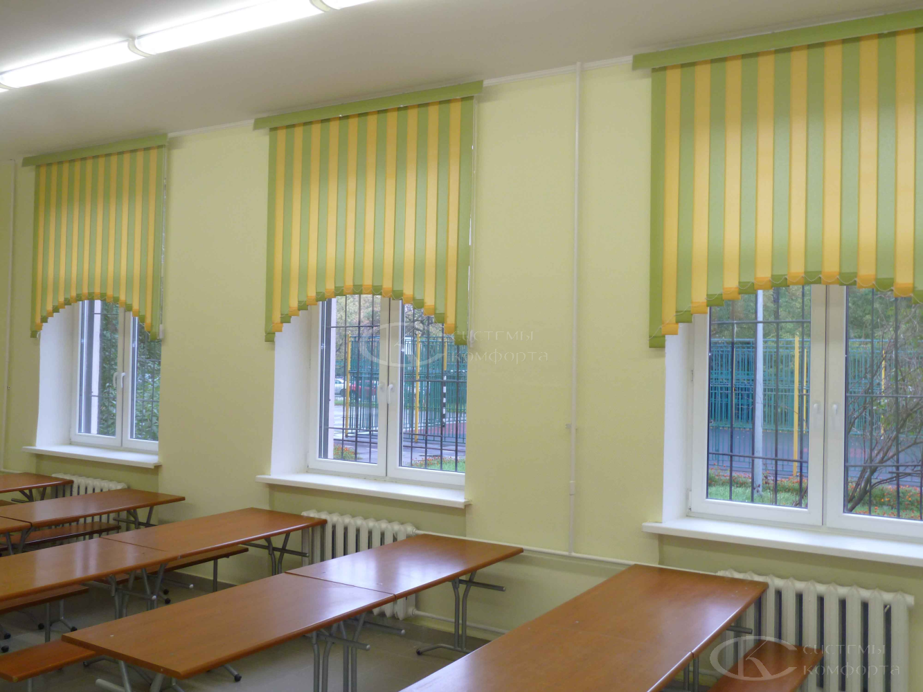 Но и забывать про то, что основной контингент храма знаний — это дети, не стоит. На этажах, где учатся младшие классы, можете не бояться добавить немного яркости и смело покупать жалюзи желтых, зеленых, синих или других цветов.