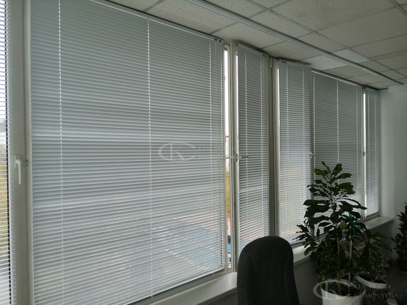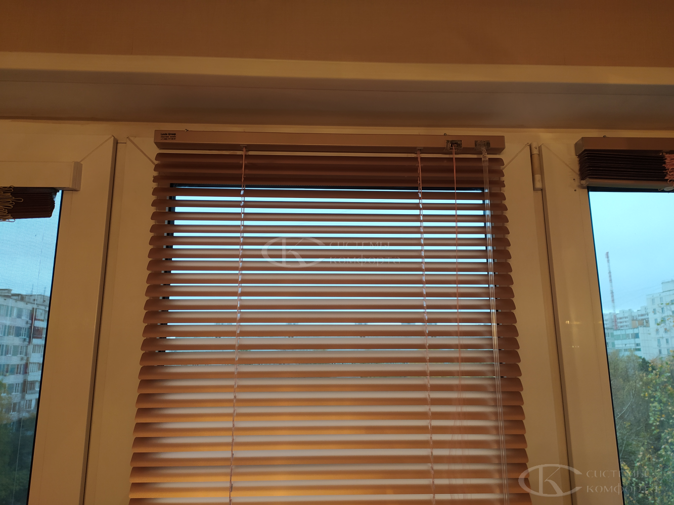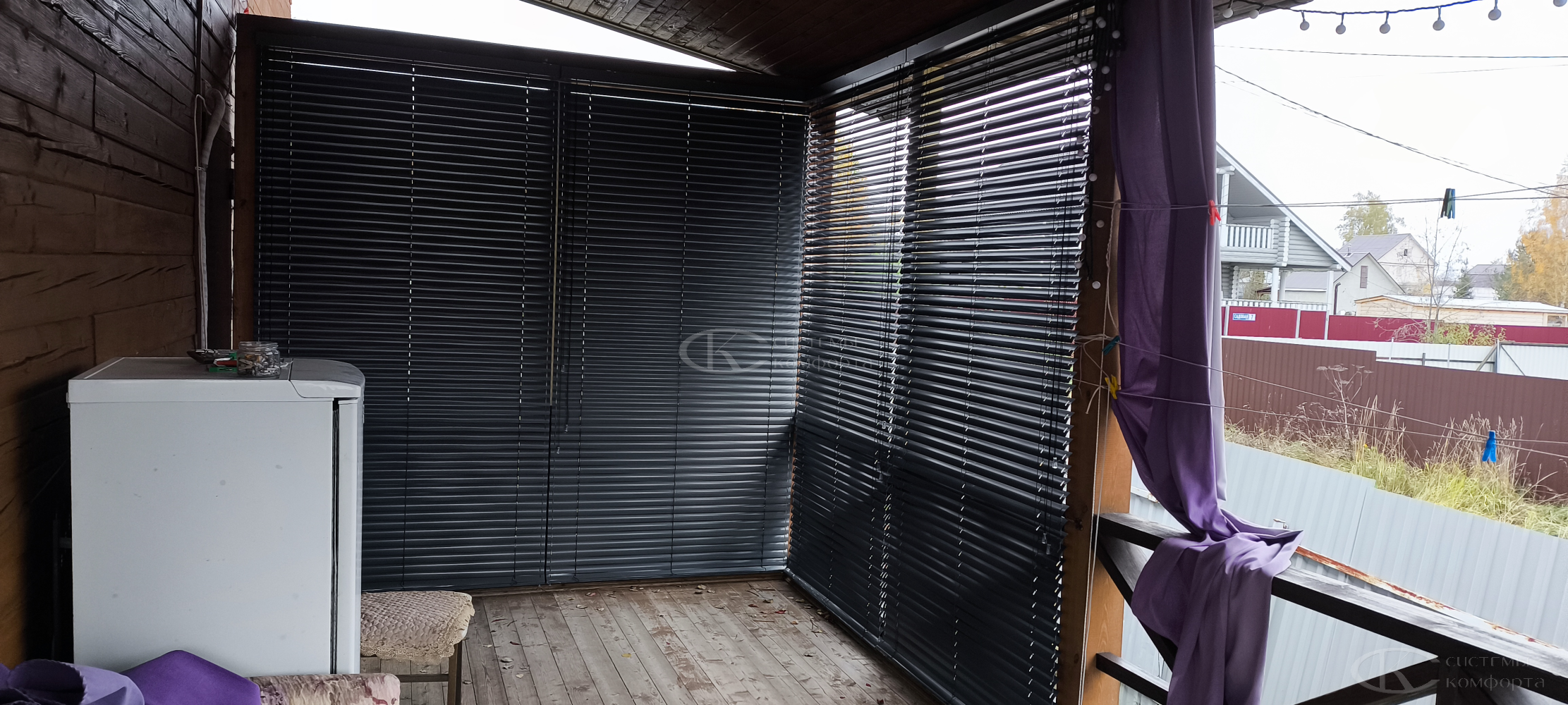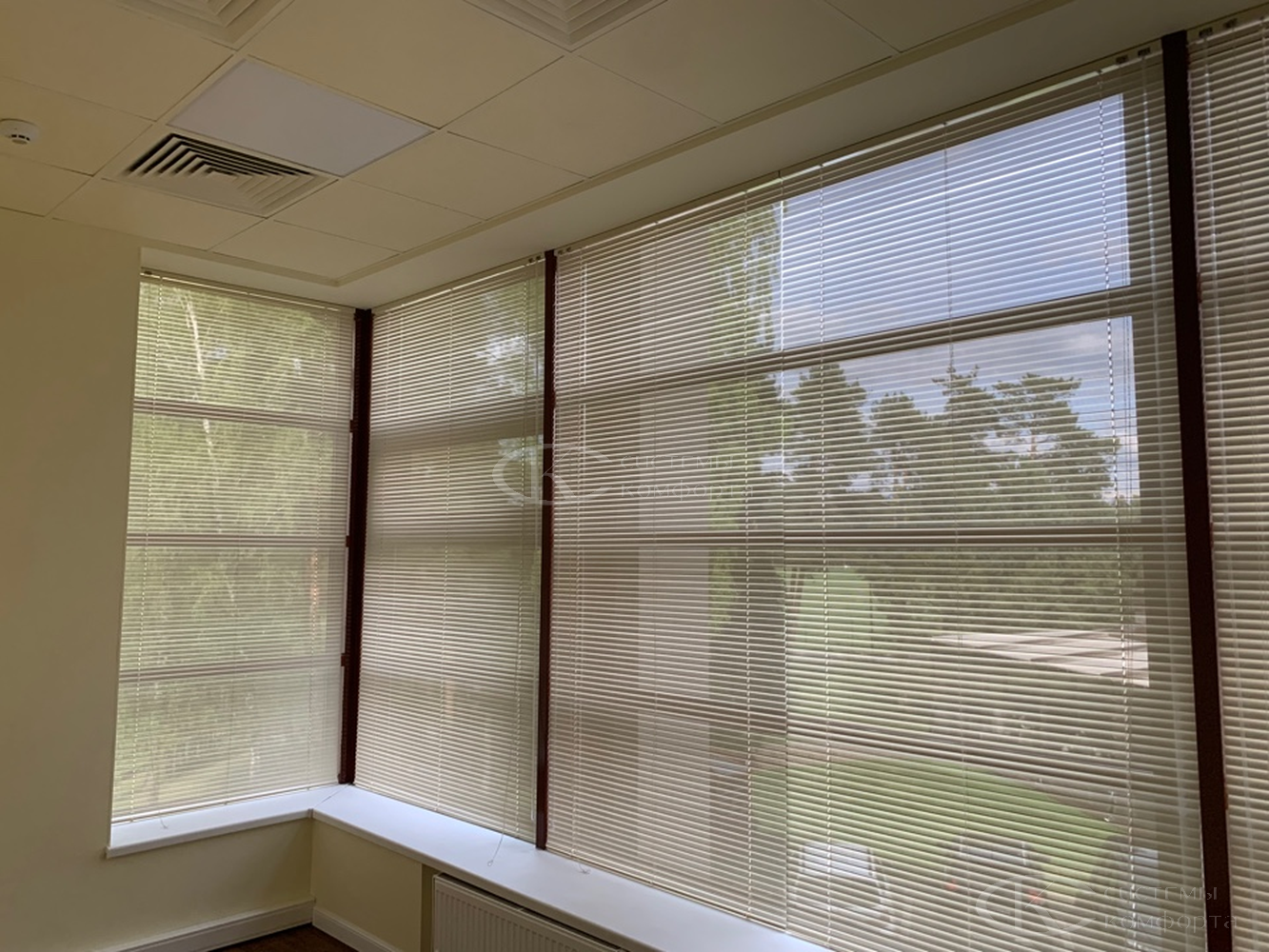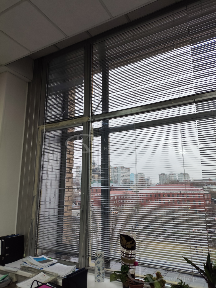 Компания «Системы комфорта» предлагает горизонтальные жалюзи с цветными алюминиевыми ламелями и перфорацией (опционально). Краска, которая используется в производстве, сертифицирована (экология), не выгорает на солнце и не истирается весь срок службы изделия.