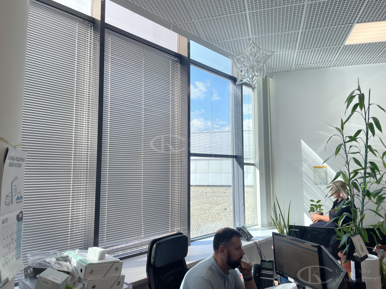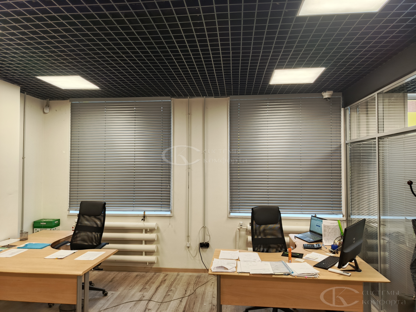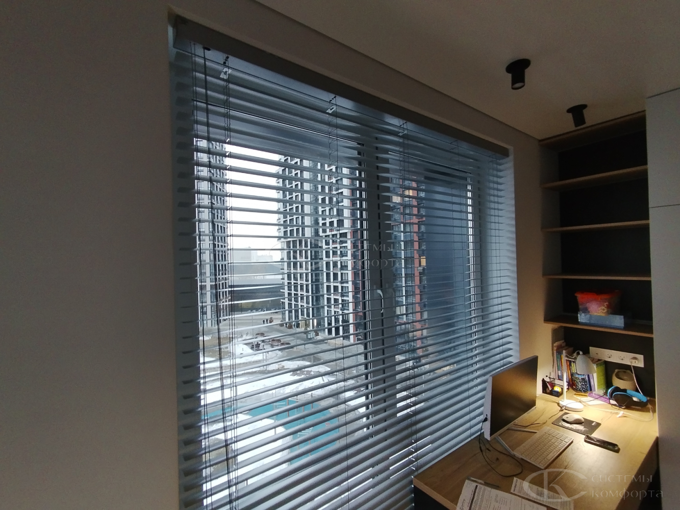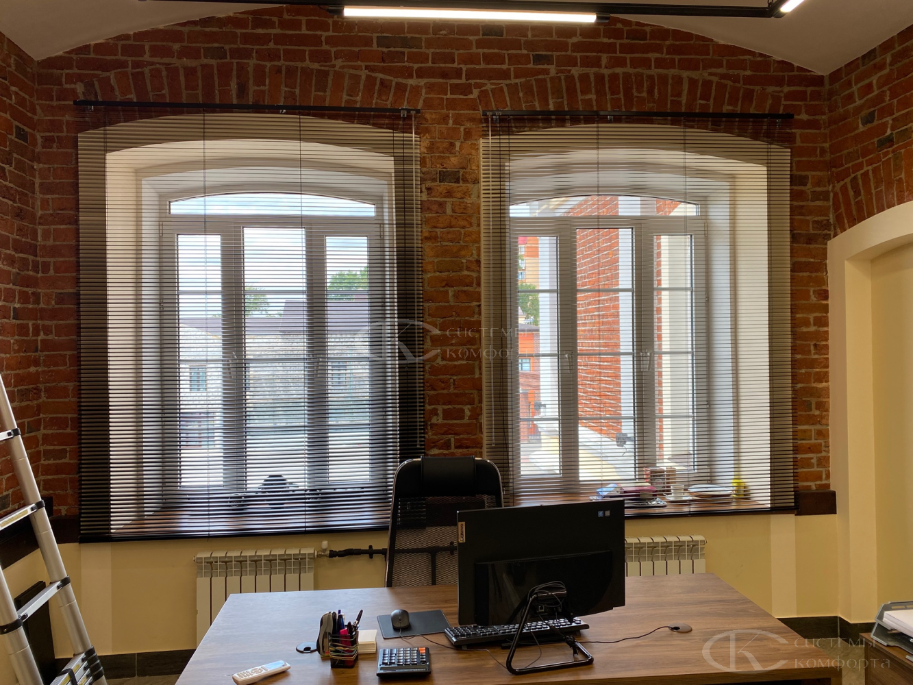 Компания «Системы комфорта» предлагает горизонтальные жалюзи с цветными алюминиевыми ламелями и перфорацией (опционально). Краска, которая используется в производстве, сертифицирована (экология), не выгорает на солнце и не истирается весь срок службы изделия.