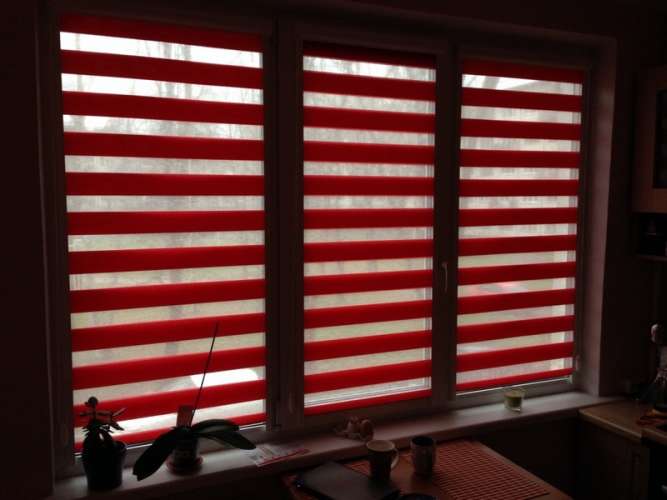Это рулонные шторы для кухни, которые создаются из двух видов тканей, перемежающихся полосами. При помощи цепи управления можно смещать полосы из разной ткани относительно друг друга так, чтобы полотно стало состоящим только из более прозрачных или из более темных полос. Такие шторы смотрятся оригинально, при этом они неприхотливы в уходе: их просто протирают при необходимости влажной губкой.