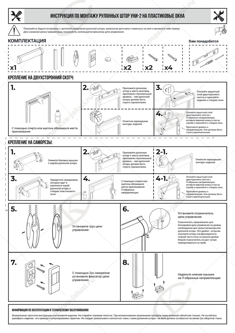 | Комплектация: | кассета (короб) с тканью и цепью управления, боковые направляющие, фиксатор цепи и системы крепления – без сверления (на двусторонний скотч) или на саморезы. По умолчанию – цвет фурнитуры белый. |